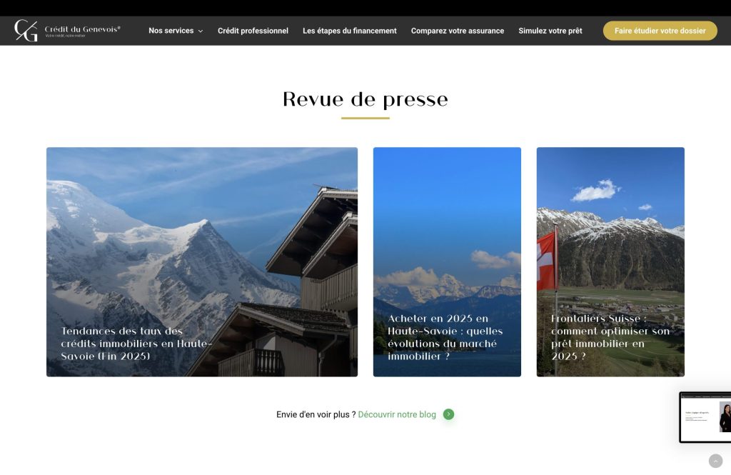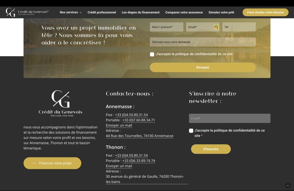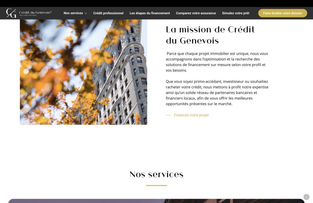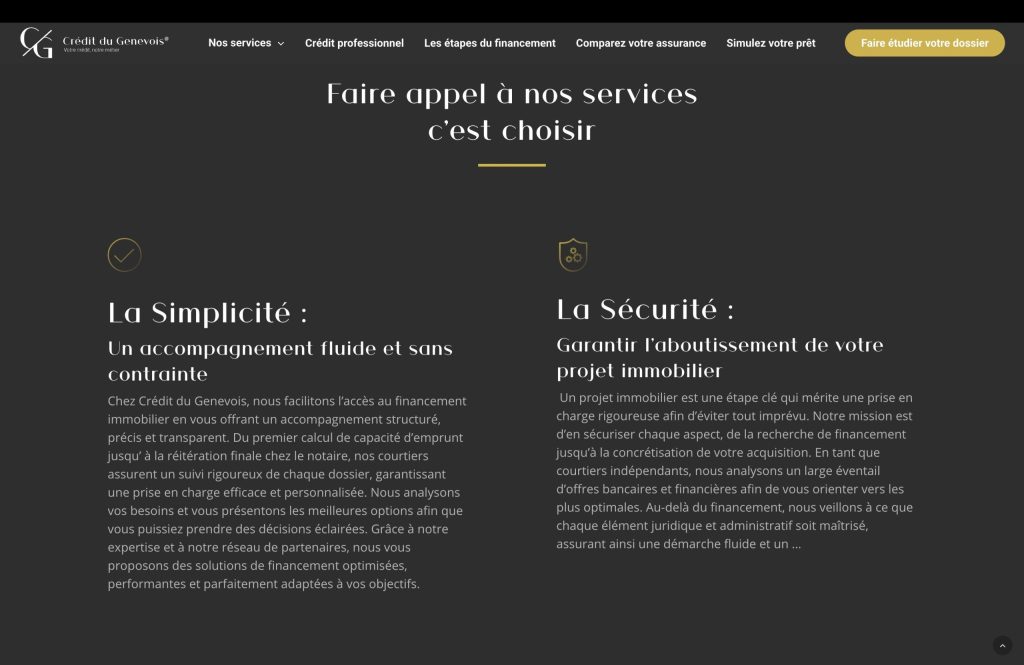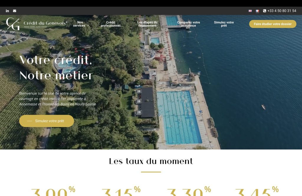 La touche d’Appiweb dans ce projet a été de concevoir une expérience en ligne rassurante et orientée conversion. Nous avons structuré les informations pour guider rapidement l’utilisateur (services, étapes, simulateur, contact), tout en assurant une navigation fluide sur mobile comme sur ordinateur. L’objectif : permettre aux visiteurs de comprendre immédiatement l’offre de Crédit du Genevois et de passer à l’action simplement, que ce soit pour une simulation ou une demande de financement.