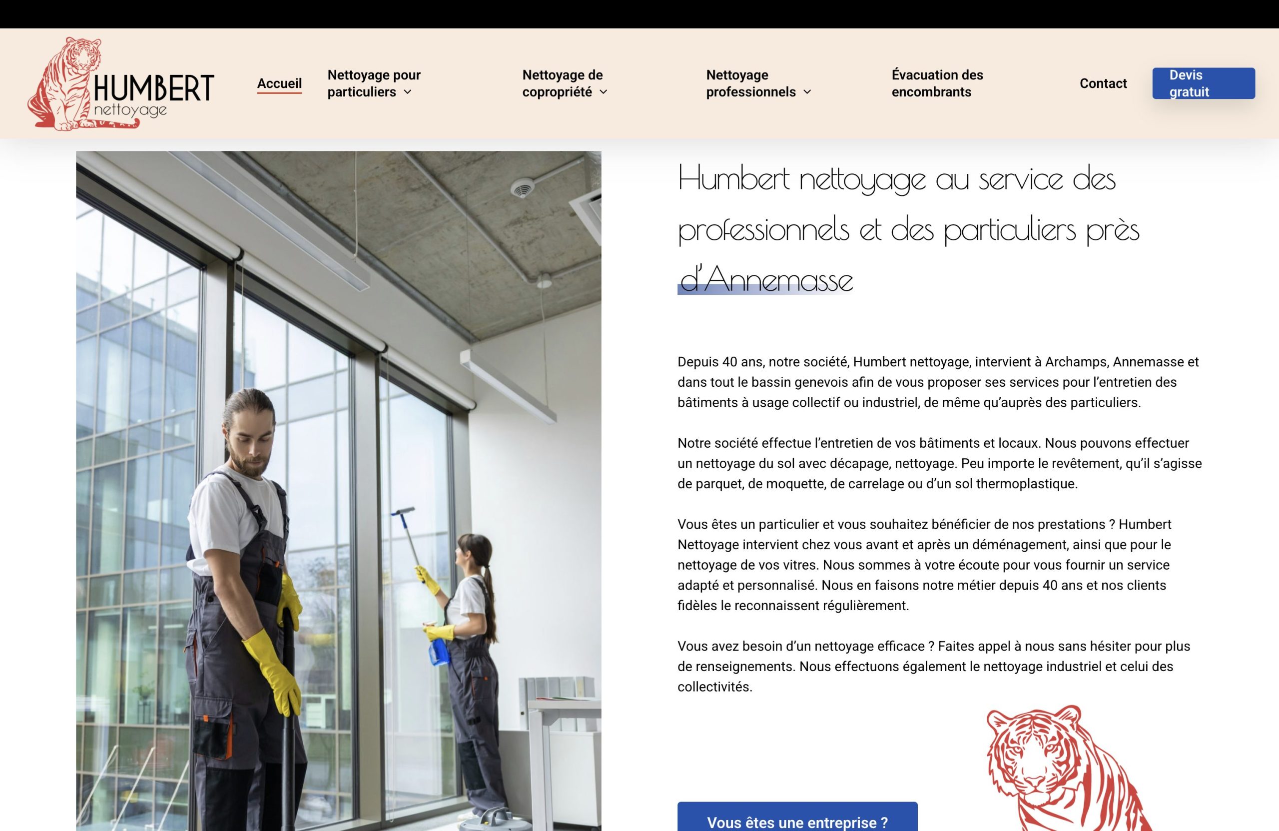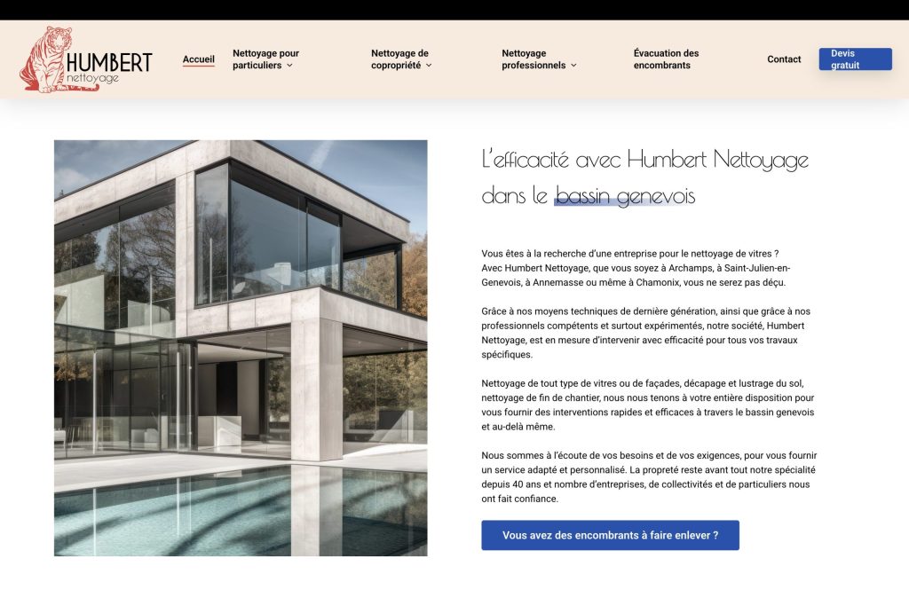 Humbert Nettoyage est une entreprise de propreté implantée en Haute-Savoie, au service des collectivités, des professionnels et des particuliers depuis 40 ans. Elle intervient autour d’Archamps, Annemasse et plus largement dans le bassin genevois pour l’entretien de locaux et bâtiments (copropriétés, bureaux, ateliers/usines…), le nettoyage de sols (décapage, remise en état, tous revêtements), le nettoyage de vitres (y compris avec nacelle), ainsi que l’évacuation des encombrants.