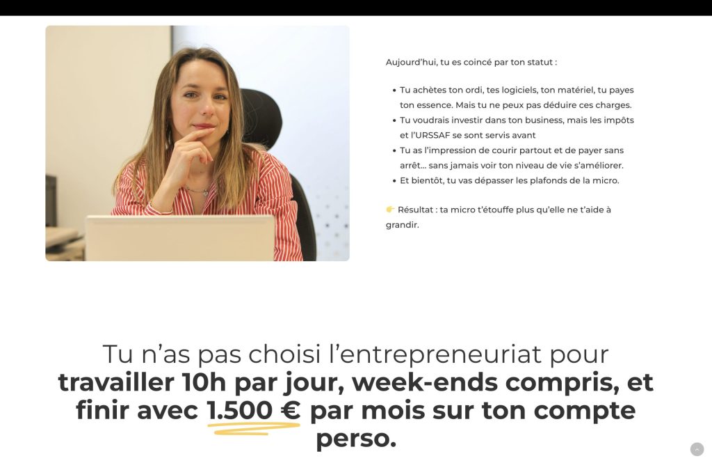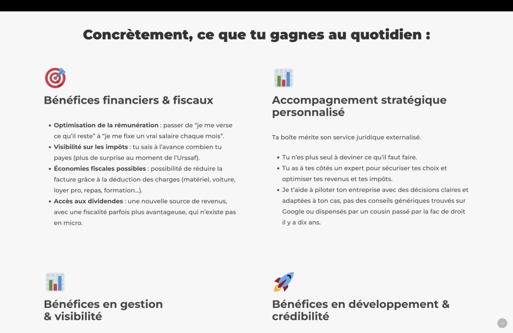 Le client a fait appel à nos services pour la création d’une landing page dédiée aux entrepreneurs, avec un objectif clair : convertir. Cette page a été pensée pour présenter une offre précise (aider les micro-entrepreneurs à passer un cap), rassurer grâce aux témoignages, et déclencher la prise de contact via une visio offerte de 30 minutes et un parcours simple en 3 étapes (créneau, formulaire, appel).