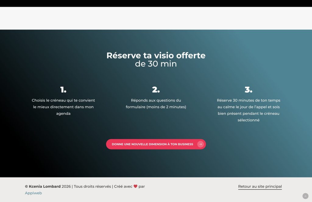 La touche d’Appiweb dans ce projet a été de concevoir une landing page très orientée performance : une structure de contenu impactante, des appels à l’action visibles à plusieurs moments de la lecture, et une expérience fluide sur mobile comme sur ordinateur. Nous avons également intégré un parcours de réservation clair (agenda + formulaire) et renforcé la confiance avec des éléments de preuve (avis), pour guider l’utilisateur efficacement jusqu’à la prise de rendez-vous.