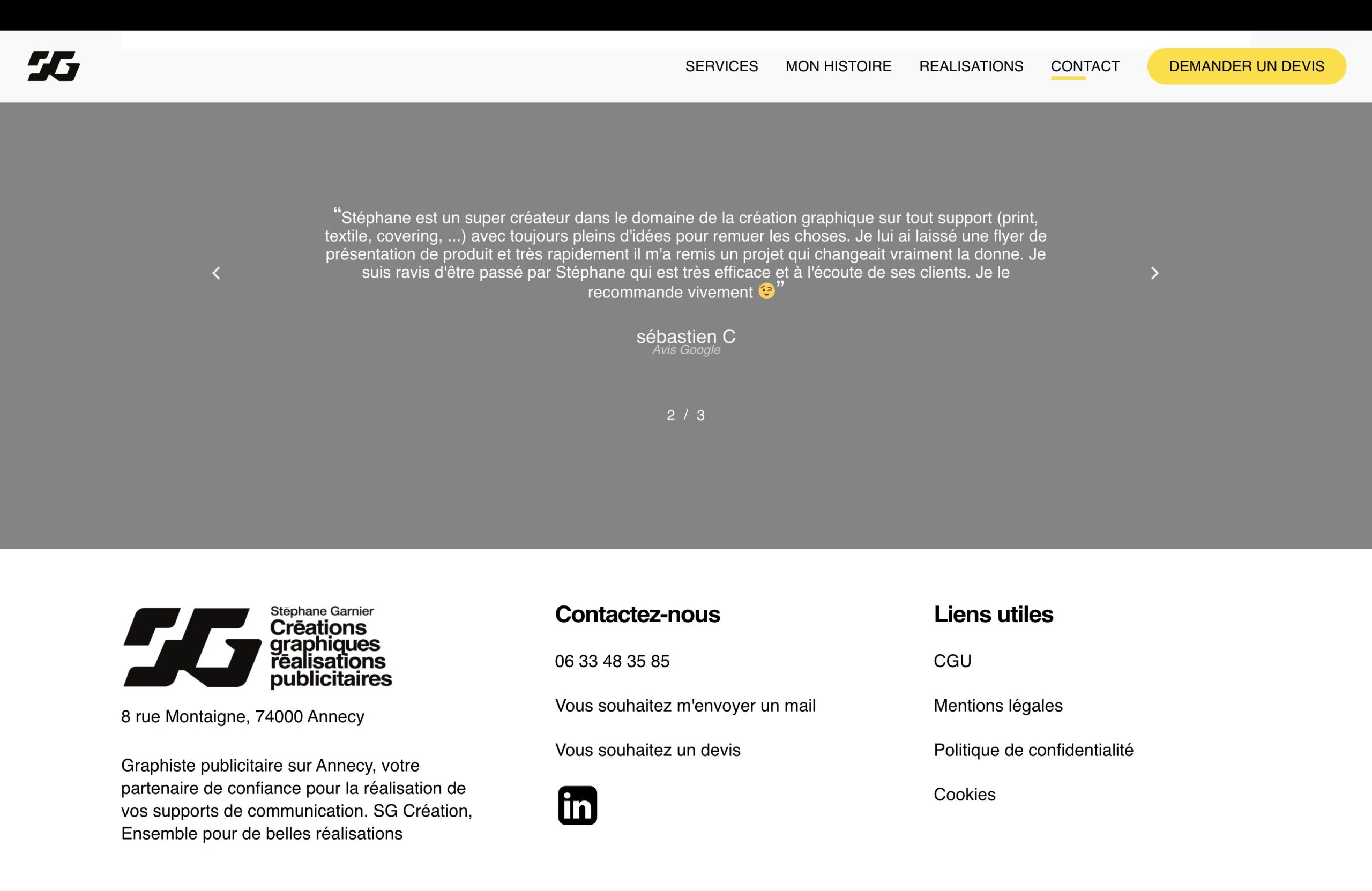 SG Création a choisi de faire appel à nos services pour la création de son site web, afin d’optimiser sa visibilité en ligne et de mieux présenter son univers. L’objectif était de disposer d’un site moderne et structuré, permettant de mettre en avant ses prestations, ses réalisations (portfolio) et de faciliter la prise de contact via une demande de devis.
